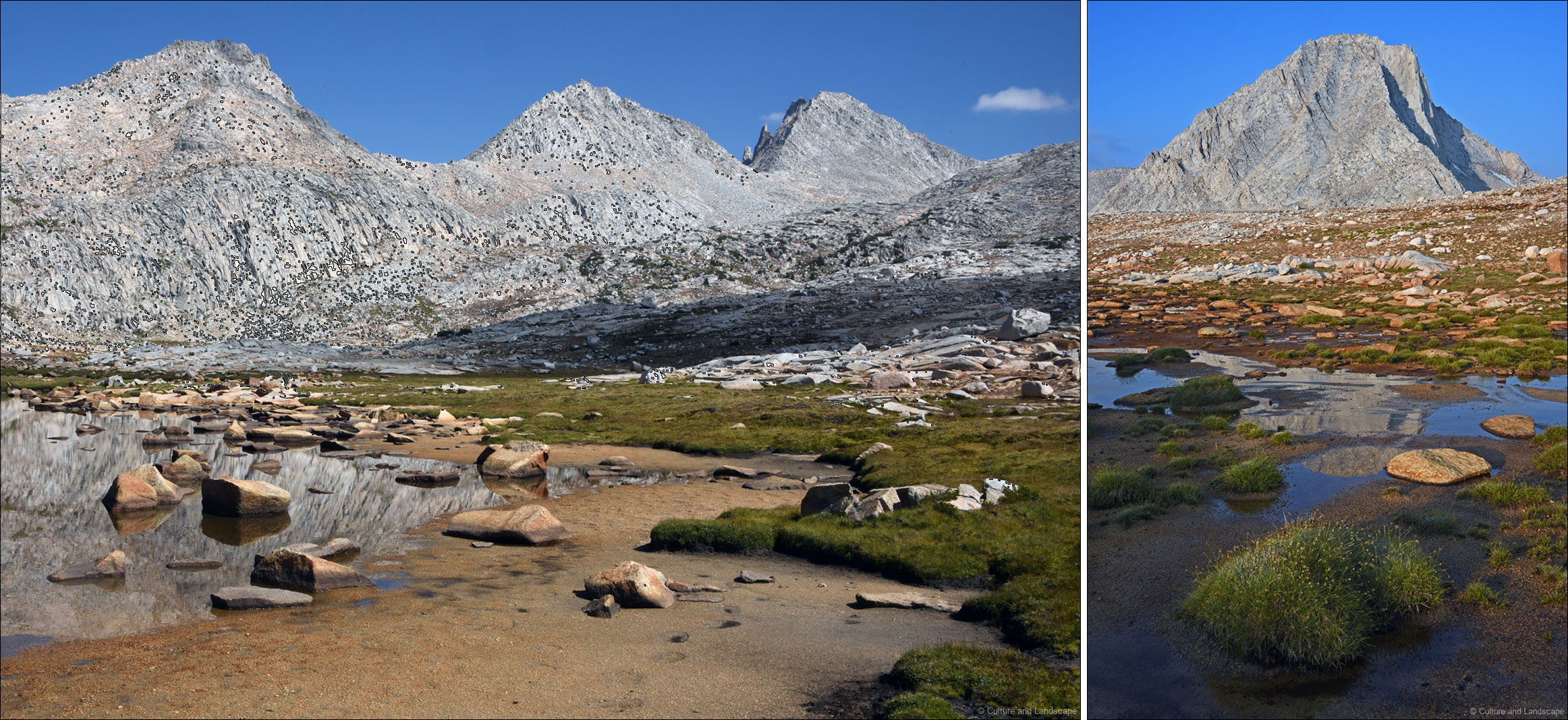 A week of backpacking in the John Muir Wilderness in the Sierra Mountains of California was a demanding physical test of off-trail travel and a deeply fulfilling experience of rugged mountain terrain and high elevation lake basins. For a large group of photographs of this wilderness location, see the Sierra Range gallery.